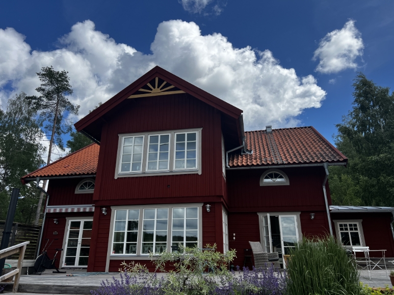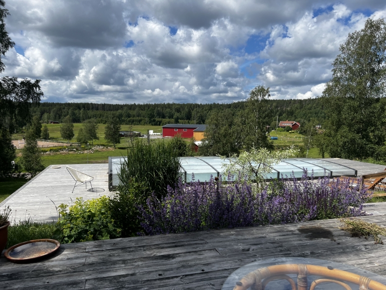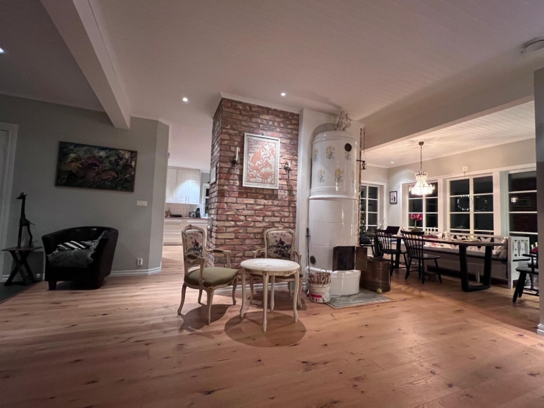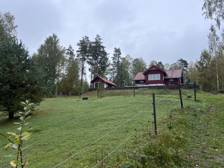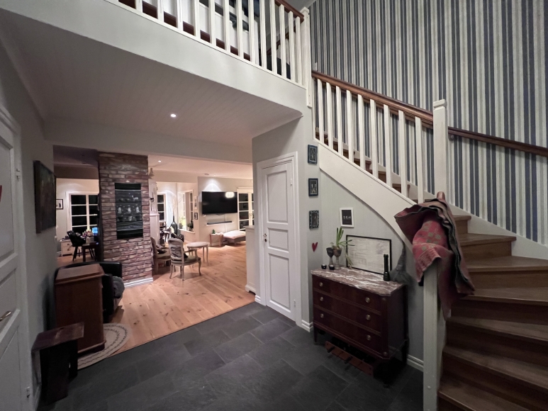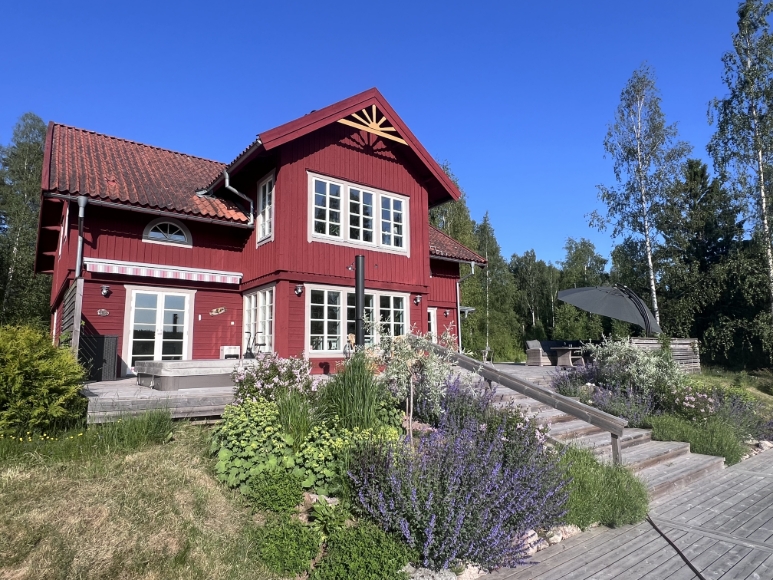 2-vånings arkitektritad villa på egen tom om ca 5.000 m2. Ligger högt med fantastisk utsikt över en dalgång där det finns en stor hästgård. Därför ser du alltid betande hästar samt träningsanläggningen där du på en ca 200 m2 stor altan kan se pågående träningar. Framför huset ligger även en pool (4x10 m) samt ett poolhus med vedeldad bastu. Huset har laddning för elbi, 12 kWh. Till huset hör även egen badplats med brygga och båt i sjö ca 800 m från huset. Även fiskerätt i sjön ingår. Där finns aborre, gädda samt kräftor.