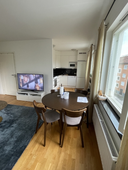 Rymlig 2:a (1:a i kontraktet då sovrummet saknar fönster). Hörnlägenhet på högsta våningen, med ljusinsläpp från soluppgång till solnedgång. 4 min promenad till Fruängen tunnelbana samt centrum med nödvändiga butiker. 10 min promenad till Långbroparken för fina grönområden. Disk- och tvättmaskin finns i lägenheten, samt tvättstuga på bottenplan.