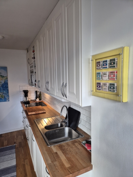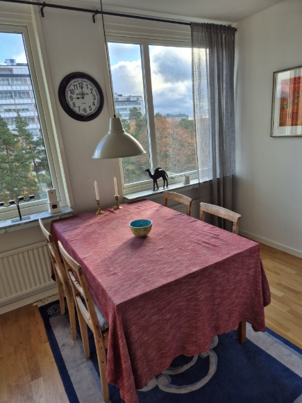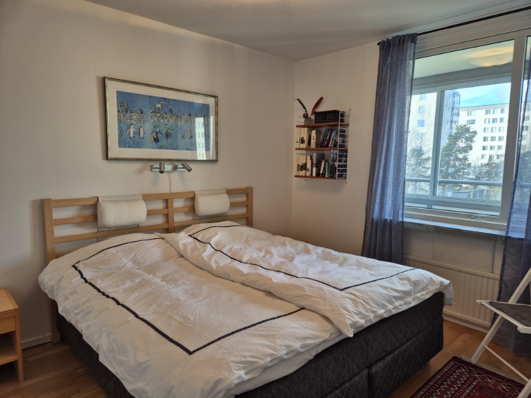 Ljus lägenhet på 4:e våningen med stor inglasad balkong i västerläge. Trevligt möblerad med bl.a. dubbelsäng i båda sovrummen. Lugna omgivningar med närhet till bl.a. ICA butik, skolor och dagis. 10 minuters gångväg till Danderyds sjukhus, Mörby station och Mörby Centrum med många butiker, restauranger och service. Därifrån går tunnelbanan till Stockholms centrum på 15 minuter. Närhet till bad I Edsviken. I planlösningen ser ni en klädkammare som kommer att vara avstängd under uthyrningsperioden.