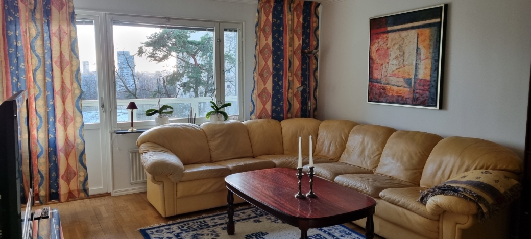 3 rum 2 toa med dusch möblerad balkong. T-bana västra skogen 3 min till centra sthlm 7 min med Tbana utsikt delvis sjön nära skola butiker restauranger ströområden mm. Djur- och rökfri.
