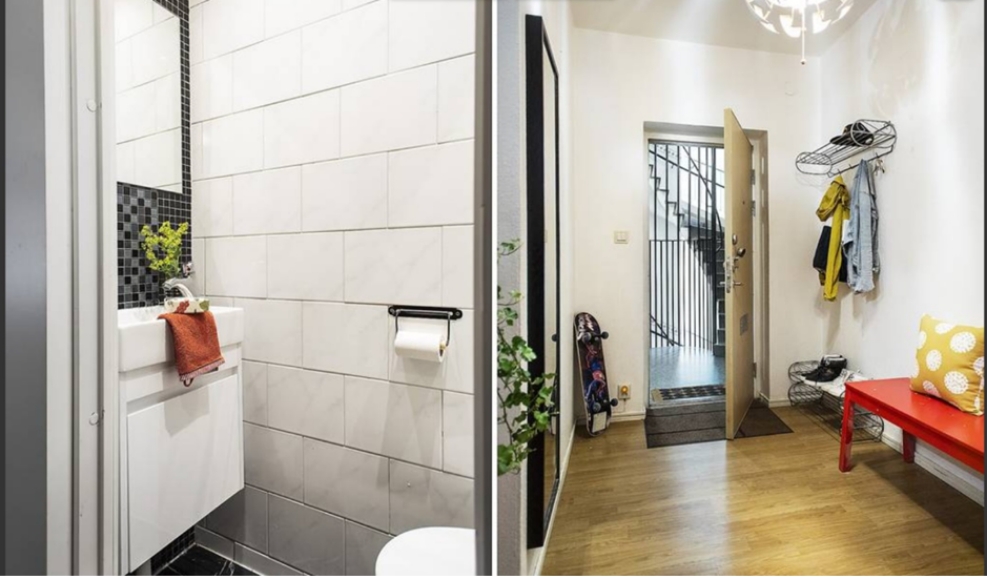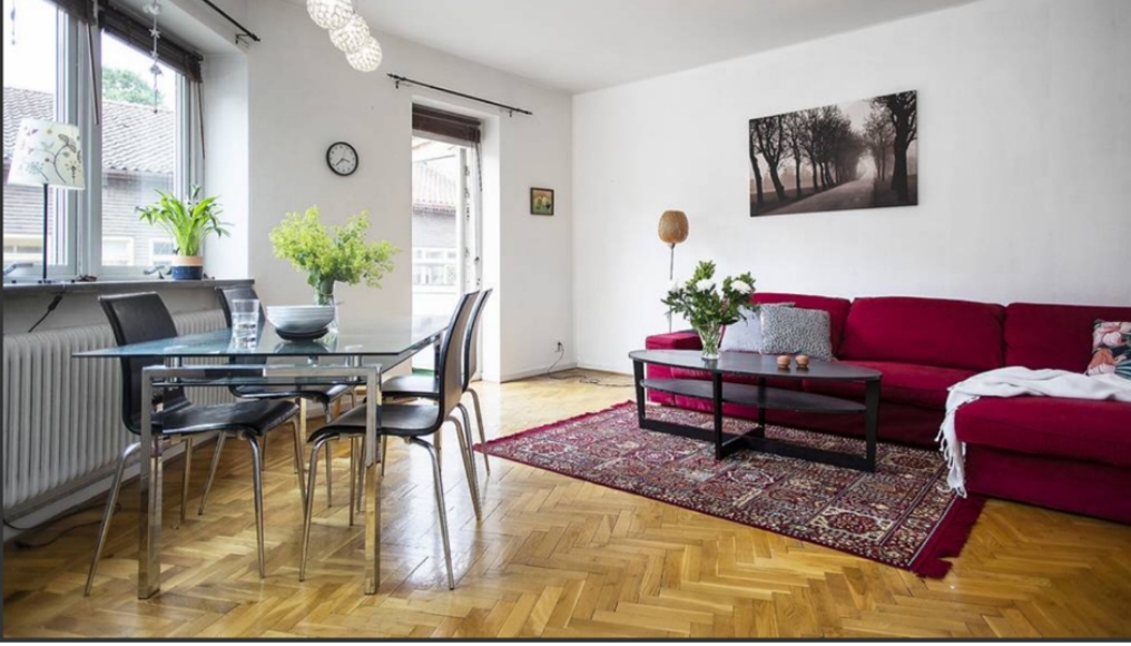 Large spacious apartment in Central Helsingborg This apartment is in the slotthojden area, 250 m from Sundstorget and 750 m from Knutpunkten (central station), 900 m from Lasarett and 600 m from Olympia. The sea front and sea beaches are 700 m and it is a 100 m walk to the Kärnan Castle garden. The kullagatan (walking street) is another 150 m where all the shops and restaurants are located. Housing description Hall: Welcoming hall with light walls to hang coats, hats and put down shoes. Hall closets for storage of additional winter clothes. Guest toilet: A few steps into the hall is the new guest toilet with dark marble-like tiled floor and white tiles. Bathroom: The bathroom is also renovated with luxurious marble-like tile floors, white tiles and spotlights in the ceiling. There is also a shower, toilet, sink with chest of drawers, mirror cabinet and heated towel rail, with washing machine and a dryer. Living room: Generous living room with beautiful herringbone parquet. From here we also go out to one of the two balconies on the floor, with a view of both Kärnan castle and up and down the Långvinkelsbacken. Kitchen: Newly renovated stylish kitchen in black and white, with dining area by the window. Bedroom 1: Really large bedroom with plenty of space for both a double bed and wardrobes. Additionally, this room has a sit-in space cum study overlooking the exit to the second of the two balconies on the floor. Bedroom 2: Nice room with plenty of space for a double bed. , Renovations The kitchen is newly renovated (0-5 years) The bathroom is newly renovated (0-5 years)