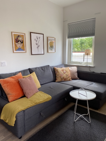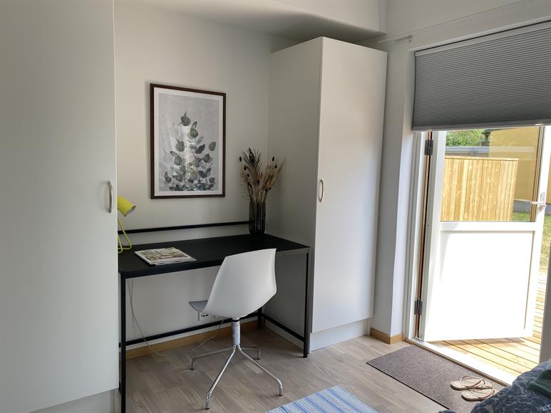 Denna mysiga och välplanerad lägenhet ligger i lugna Länna, en kort promenad ifrån Söderport och Visby ringmur. Den har ett separat sovrum med två 90 sängar (inkl. täcken och kuddar), skrivbord, garderober samt utgång till en härlig altan med morgonsol. Köket är fullt utrustat med allt du kan tänkas behöva, som t.ex. mikrovågsugn, kaffekokare, vattenkokare, brödrost, stekpannor, kastruller, tallrikar, glas, bestick etc. Här finns även dammsugare, strykjärn, hink, svabb medmera. I badrummet finns dusch och kombinerad tvättmaskin/torktumlare. I vardagsrummet finns soffa samt ett litet köksbord för två. Här finns också TV:n. En privat parkeringsplats finns i anslutning till huset.