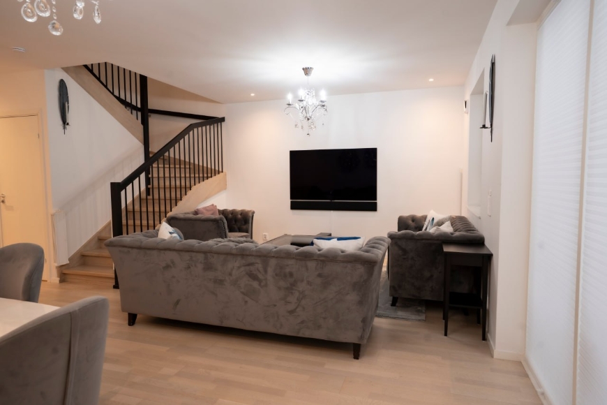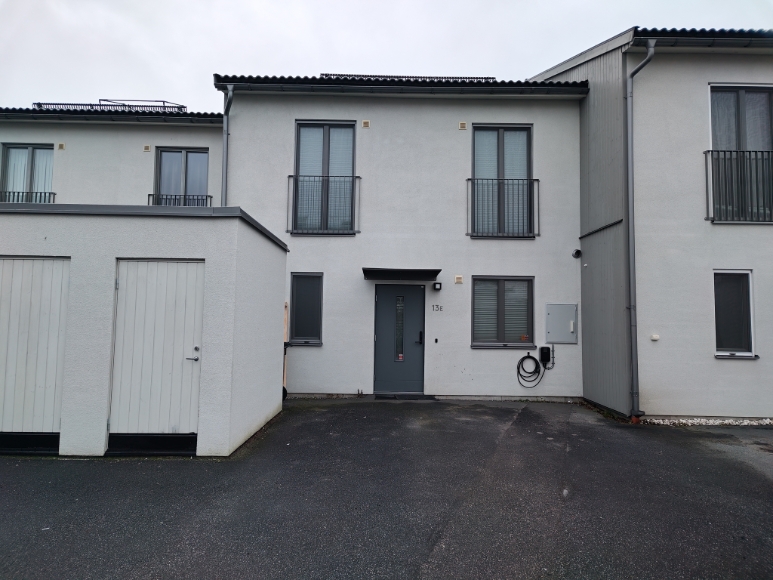 Ett radhus i Glasberga, 3 sovrum, badrum och sittgrupp/TV-hörna på första våningen, matsal/TV-rum, kök, badrum och ett litet förråd under trappan på bottenvåningen. Fullt möblerad och inflyttningsklar.