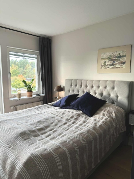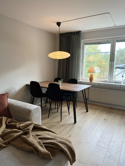 Mysig och trivsam lägenhet uthyres. Två fina bra sovrum med nya sängar och bra ny förvaring. Har alla funktionaliteter och bekvämligheter. Balkong med härlig kvällssol. Nära till grönområde, badstrand, badhus och ishall. Buss utanför dörren som tar dig till pendeltåget. En promenad till pendeln tar ca 15min. Bostaden är möblerad men kan hyras ut omöblerad vid önskemål.
