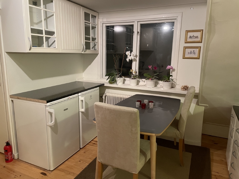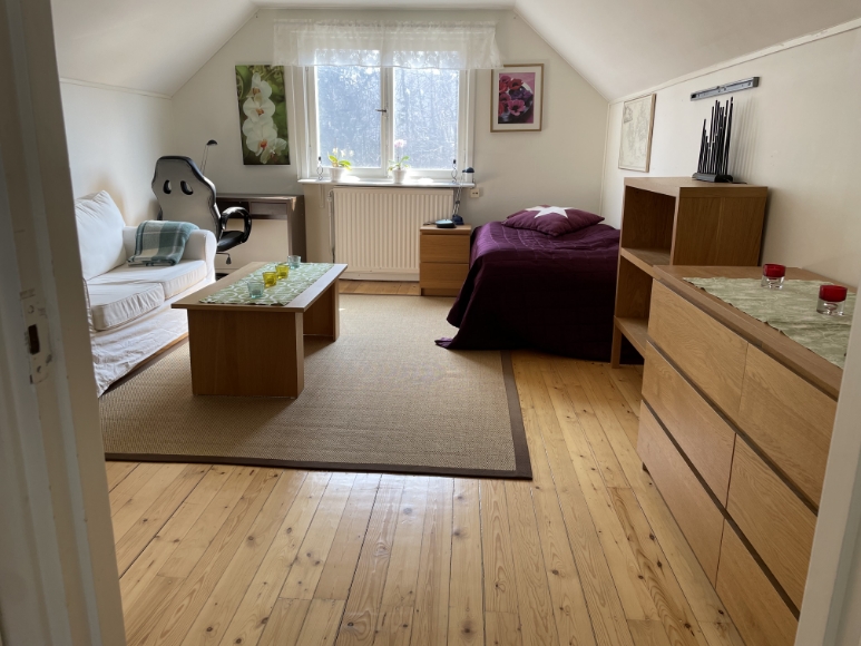 Egen övervåning i villan.. Gemensam hall, där dörr till övervåning/uthyrningsdel finns. Stort möblerat rum med fönster i söderläge. I trapphallen finns pentry med kyl/frys, kokplatta, mikro, vattenkokare, kaffebryggare, brödrost och airfryer. Även ett matbord med två stolar. Badrum med wc, dusch, badkar. Tvättstuga i källaren med tvättmaskin och torktumlare. P-plats utanför huset. Hyrs ut endast till 1 person!