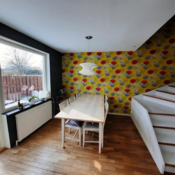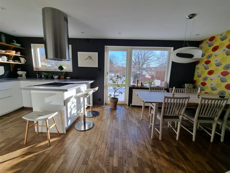 Spacious, bright and pleasant townhouse of 170 m2 on 3 floors near green areas in popular Solhem with excellent communications. Odenplan can be reached in 10 minutes by commuter train from Spånga station. The house has 4 bedrooms, 2 living rooms/family rooms, a spacious kitchen with generous dining area, a guest toilet, a bathroom, a laundry room and a sauna with shower. The plot has 2 patios, one of which is sunny south facing. The house is heated with district heating which provides a stable and low energy cost.