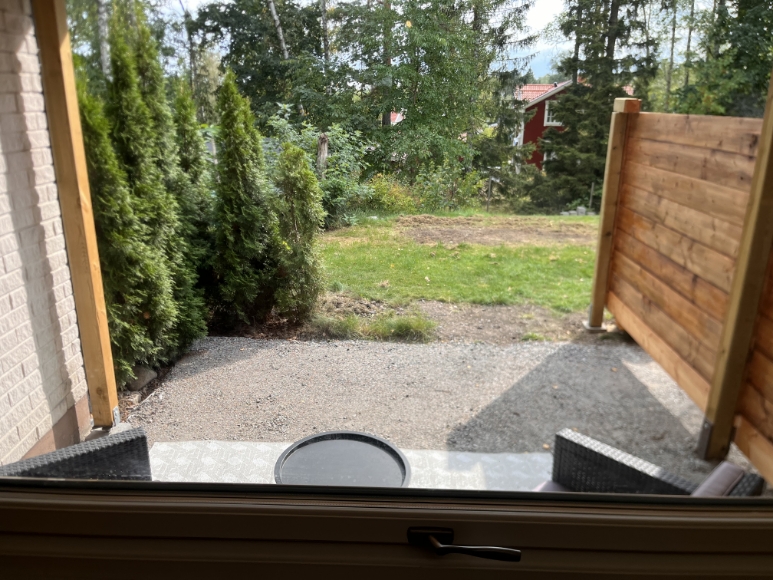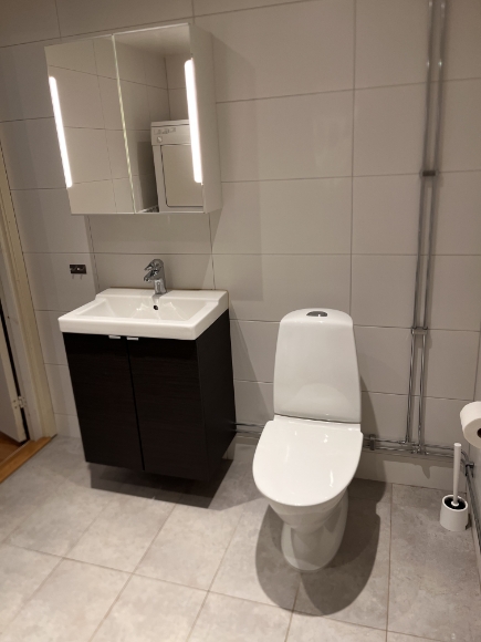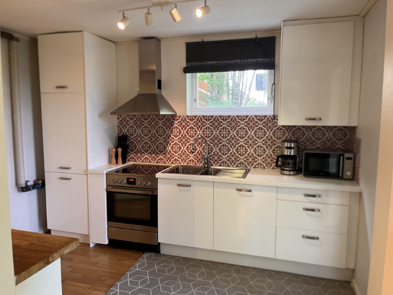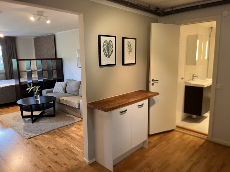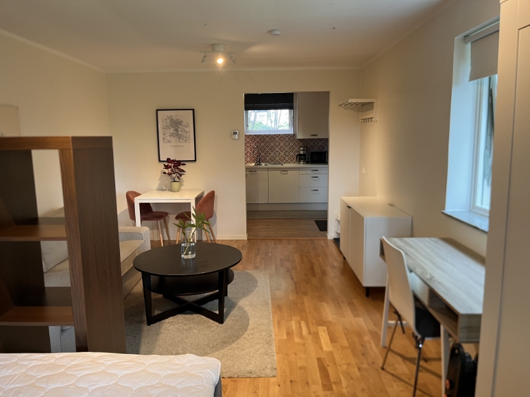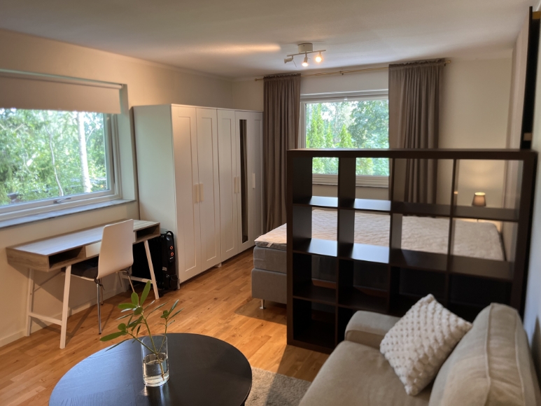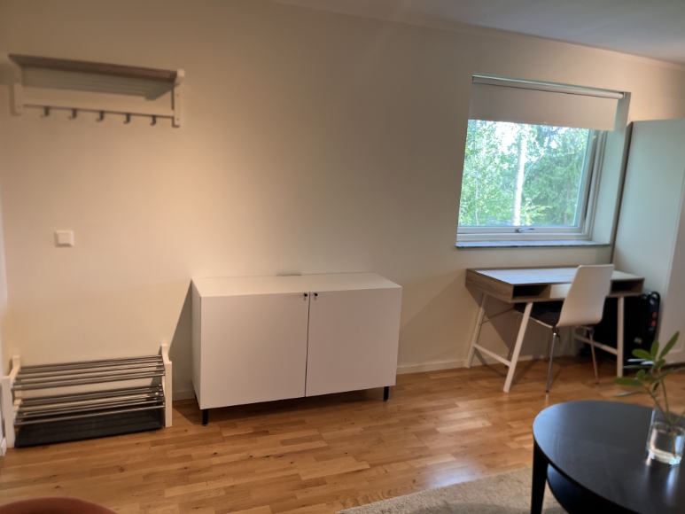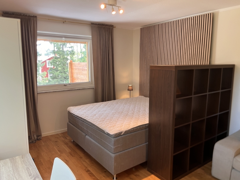 Lägenhet i villa med egen ingång. Egen del av uteplats. Lugnt villaområde i Täby, utsikt mot fint skogsparti. Ca 5 min gång till närmaste busshållsplats (616) och 8 min till buss 611. Bussarna går till Täby Centrum där Roslagsbanan går (direkttåg till KTH) samt till Mörby Centrum där tunnelbanas röda linje finns. Lägenheten är fullt möblerad och har en 160 kontinental säng, fullt utrustat kök med diskmaskin, husgeråd, porslin, mikro, kaffemaskin, vattenkokare, brödrost, dammsugare etc. Badrummet har en dusch samt både tvättmaskin och torktumlare. Lägenheten har stora fönster som vetter mot ett lummig skogsparti, väldigt insynsskyddat. Denna lägenhet passar en person som uppskattar ett lugnt läge nära naturen. Willys mataffär finns ca 600 m från huset. Tyvärr finns det ej parkeringsmöjligheter, så någon utan bil. MC går bra. Lägenheten hyrs ut tillsvidare till max 1 person, dock minst 6 månader men gärna längre. Husdjur kan diskuteras.
