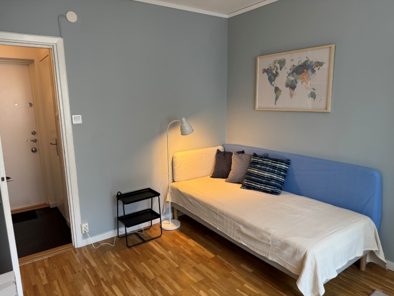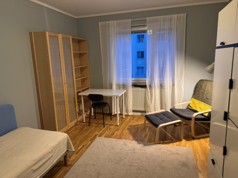 Separat uthyrningsdel av större lägenhet uthyres i trevligt 50-talshus i Solna. Egen ingång med ytterdörr och vägg mellan uthyrningsdelen och resten av lägenheten. Den består av en liten hall, nyrenoverat badrum med dusch samt ett rum ca 3,5x4,5 m, fullt möblerad med nya fräscha möbler. Det finns kyl, mikrovågsugn och kaffebryggare, men inget kök, därför passar den inte så bra för heltidsboende. Perfekt för dig som jobbar i Stockholm under veckorna. Det är 5 min promenad till Arenastaden, 200 m till pendeltågsstationen Solna station där pendeltåg går till Arlanda (30 min) och Centralen (7 min). Det finns också många bussar samt tvärbanan med förbindelse till Bromma (ca 20 min).